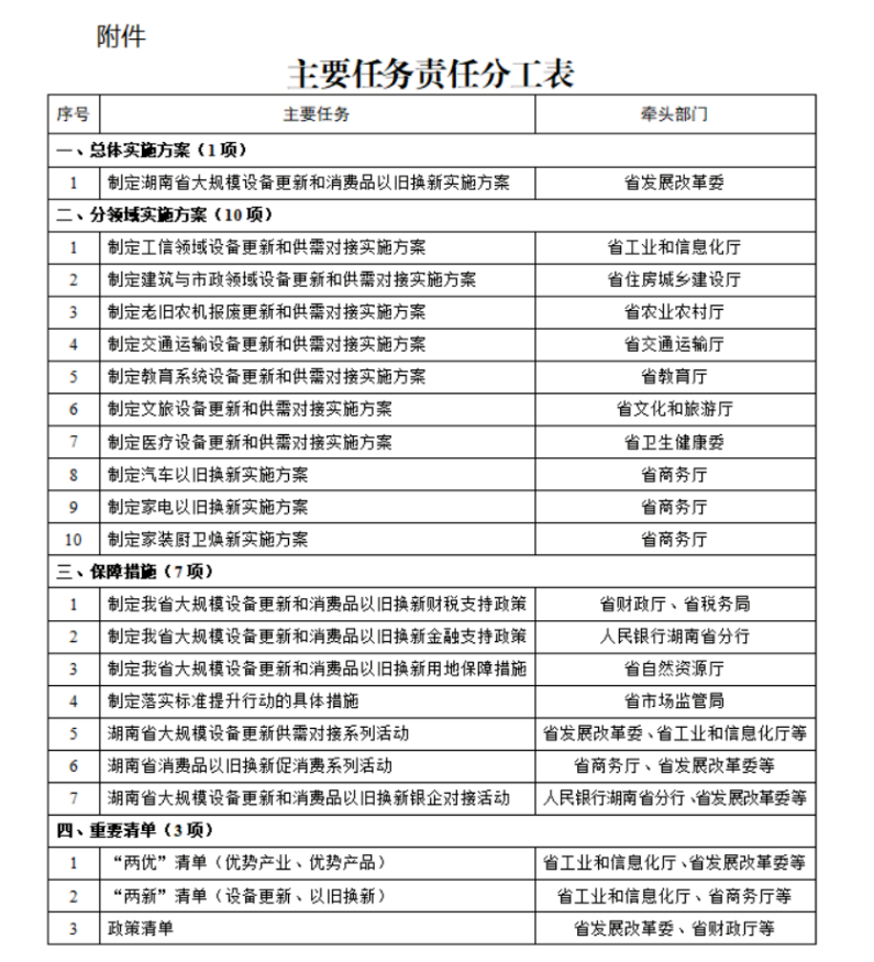 2024年4月11日,湖南省人民政府印发《湖南省推动大规模设备更新和消费品以旧换新实施方案》。