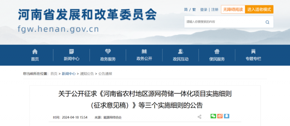 4月18日,河南省发改委公布《关于公开征求<河南省农村地区源网荷储一体化项目实施细则(征求意见稿)>等三个实施细则的公告》。