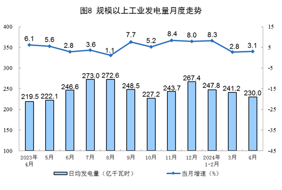 电力生产增速有所加快。4月份,规上工业发电量6901亿千瓦时,同比增长3.1%,增速比3月份加快0.3个百分点;日均发电230.0亿千瓦时。1—4月份,规上工业发电量29329亿千瓦时,同比增长6.1%。