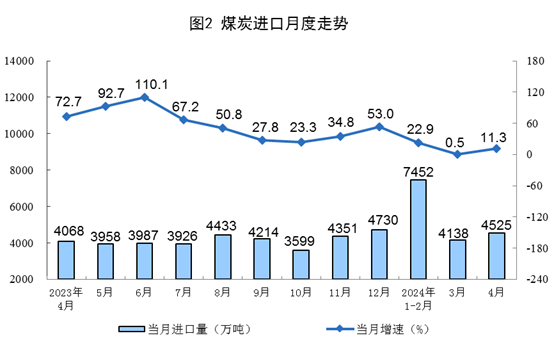 原煤生产降幅收窄,进口明显回升。4月份,规上工业原煤产量3.7亿吨,同比下降2.9%,降幅比3月份收窄1.3个百分点;日均产量1239万吨。进口煤炭4525万吨,同比增长11.3%。