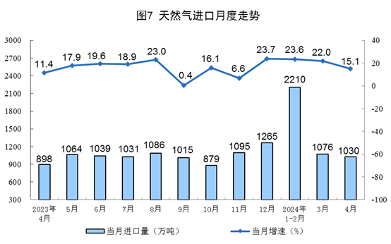 天然气生产稳定增长,进口保持较快增长。4月份,规上工业天然气产量198亿立方米,同比增长3.2%,增速比3月份放缓1.3个百分点;日均产量6.6亿立方米。进口天然气1030万吨,同比增长15.1%。