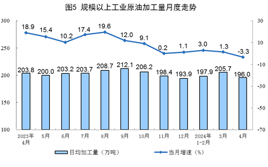 原油加工有所下降。4月份,规上工业原油加工量5879万吨,同比下降3.3%,3月份为增长1.3%;日均加工196.0万吨。1—4月份,规上工业原油加工量24126万吨,同比增长1.1%。