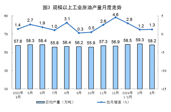 原油生产平稳增长,进口由降转增。4月份,规上工业原油产量1747万吨,同比增长1.3%,增速比3月份加快0.1个百分点;日均产量58.2万吨。进口原油4472万吨,同比增长5.9%。