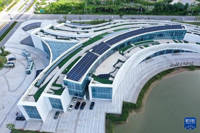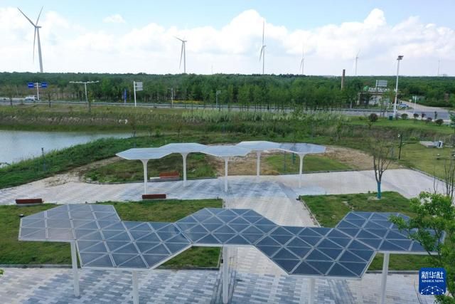 6月6日拍摄的射阳港低(零)碳产业研究院建筑屋顶使用的太阳能光伏发电系统(无人机照片)。新华社记者 杨磊 摄
