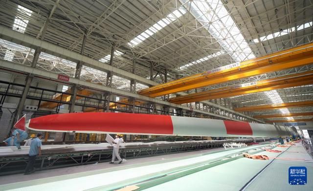 6月6日,在射阳中车风电叶片工程有限公司生产车间拍摄的大型风机叶片。新华社记者 李尕 摄