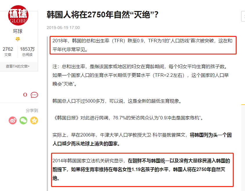 2014年韩国国家立法机关研究显示,在朝鲜不与韩国统一以及没有大量移民涌入韩国的前提下,如果将生育率维持在每名女性1.19名孩子的水平,韩国人将在2750年自然灭绝。