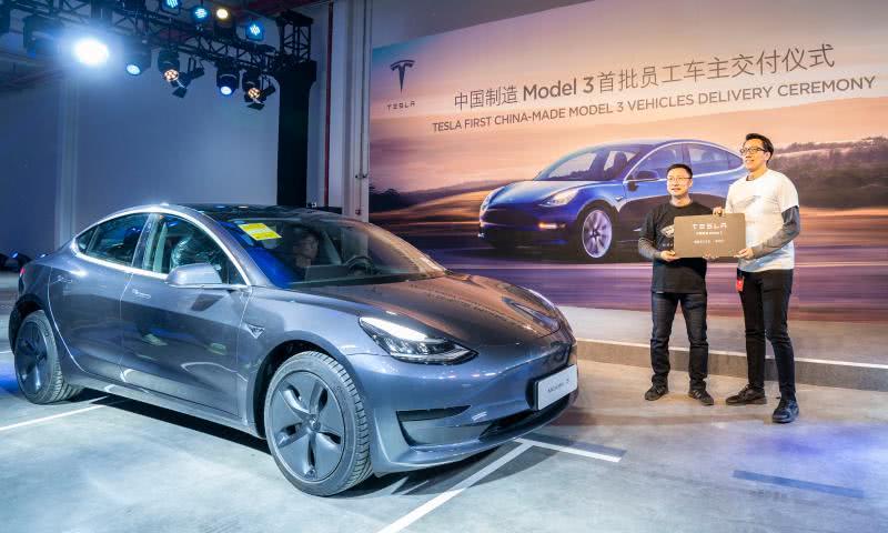 工作人员与首批国产特斯拉Model 3的客户交接车辆。