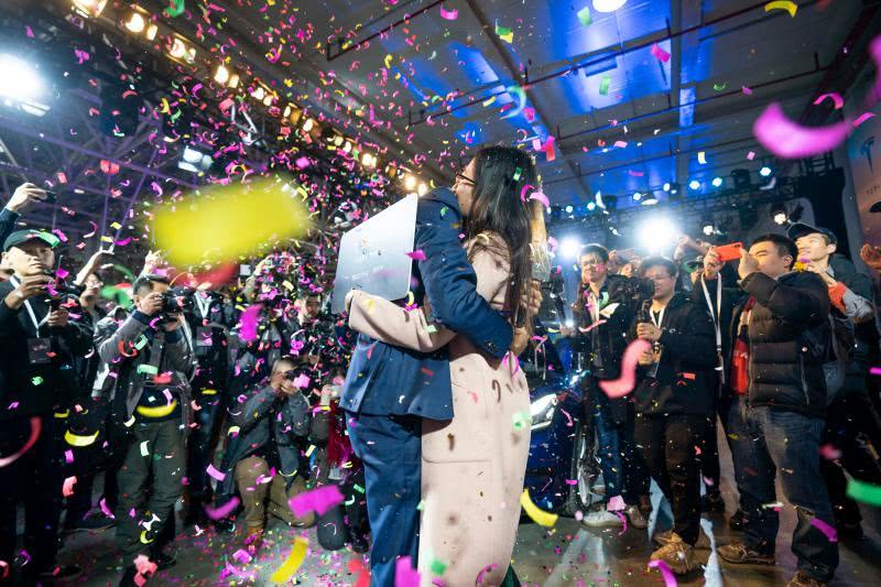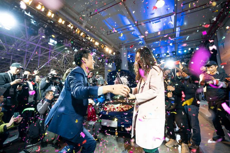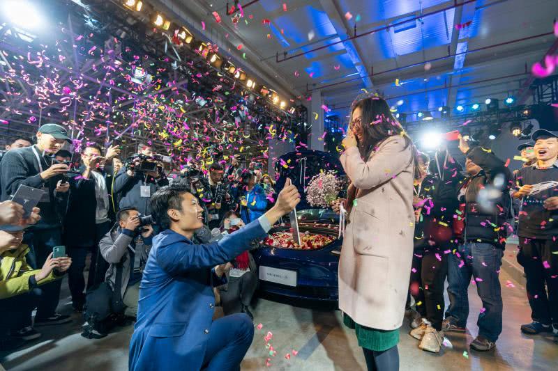 在交付现场,首批交付客户管高明向他恋爱了多年的女友现场求婚,并将刚提的国产Model3交到女友手中。