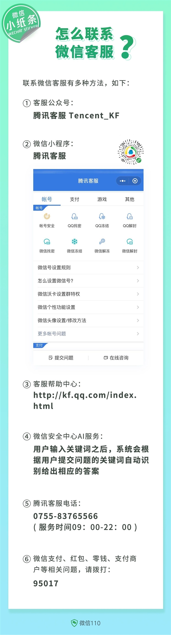 从官方介绍来看,要联系腾讯客服有至少6种方法:公众号、小程序、网站、电话等等。