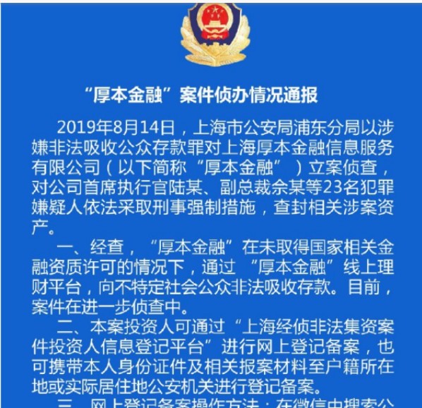 因涉嫌非法吸收公众存款罪,浦东警方于8月14日对厚本金融立案侦查,该公司CEO陆某、副总裁佘某等23名犯罪嫌疑人被控制,相关涉案资产被查封。