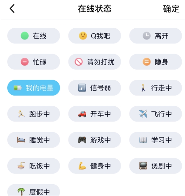 其中就有“我的电量”状态,开启后,QQ好友就能在聊天界面看到你手机的实时电量及充电状态。