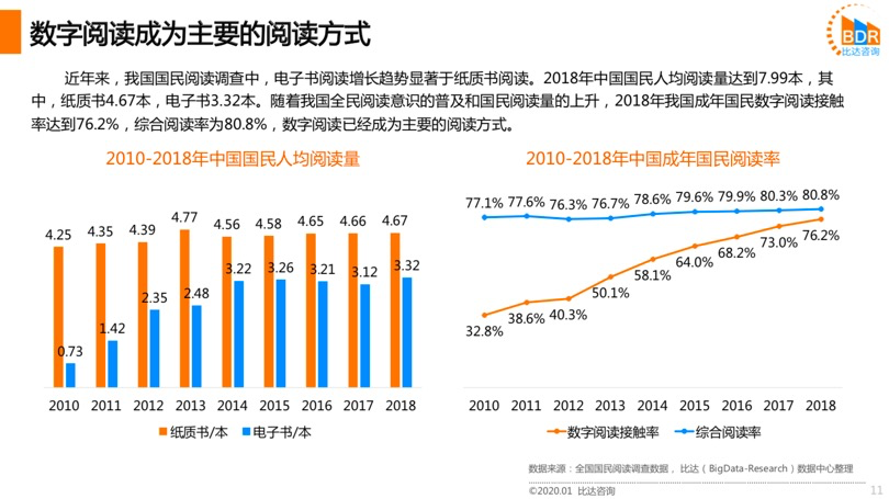 炣燃科技1月6日综合《商业观察网》报道 1月6日,国内第三方数据研究机构比达咨询(BigData-Research)发布《2019年中国数字阅读市场研究报告》。报告显示,去年我国人均阅读量达到7.99本,其中纸质书4.67本、电子书3.32本,数字阅读增长趋势显著于纸书阅读。阅文、掌阅、书旗三大数字阅读平台分别占据市场的前三位。