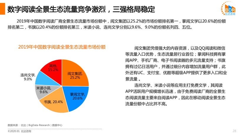 报告称,阅文集团凭借强大的内容资源以及QQ阅读、起点中文网和微信等流量入口,优势明显;掌阅科技拥有掌阅APP、手机厂商、电子书阅读器的多元流量支持,构建了丰富的数字阅读矩阵;书旗依托阿里旗下入口及资源,联合UC、支付宝、优酷等超级APP提供了更加多元化的入口和全景流量,并通过细分内容分发有效拉动了数字阅读用户在不同场景中的全新增长。