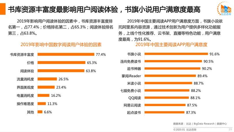 另外,在2019年中国阅读APP用户满意度排名上,书旗小说、连尚免费读书、追书神器位列行业前三。影响用户体验前三的因素分别是,书库资源丰富程度、价格和阅读体验。