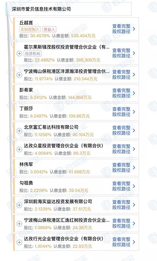 启信宝数据显示,爱贝信息成立于2010年,注册资本1758万元,公司实控人和法人均为丘越崑。股东有丘越崑、霍尔果斯锋茂股权投资管理合伙企业、宁波梅山保税港区沣源瀚泽投资管理合伙企业(下称“梅山沣源瀚泽投资”)、深圳前海实益达投资发展有限公司等12家。