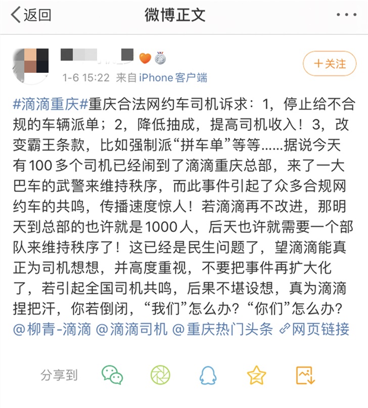 据报道,此次重庆滴滴司机的维权要求为,停止给不合规的车辆派单;降低抽成,提高司机收入;改变霸王条款,比如强制派“拼车单”。