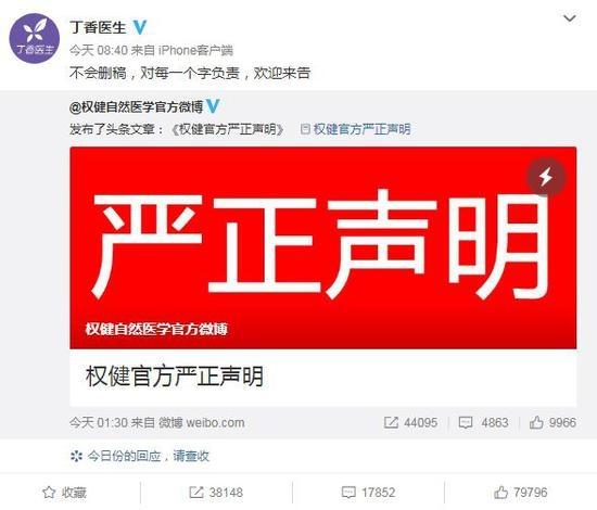 权健发布声明后不久,丁香医生转发该声明并评论称:不会删稿,欢迎来告。