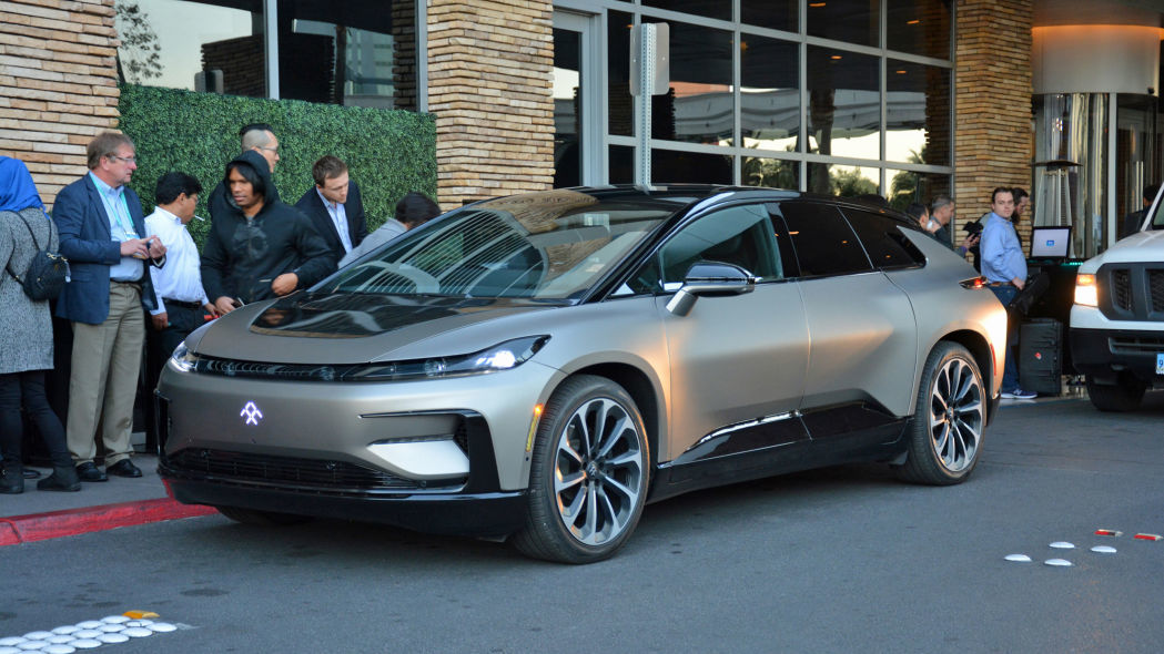 美国时间1月6日,法拉第未来FF的两辆概念车停放在CES主展馆外,引来了大批路人关注。