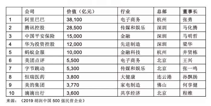 报告称,这是胡润研究院首次发布该榜单。这里的“中国民营企业”是指总部在中国大陆的非公有制企业。上市公司企业市值按照2019年11月29日的收盘价计算,非上市公司企业估值参考同行业上市公司进行估算。