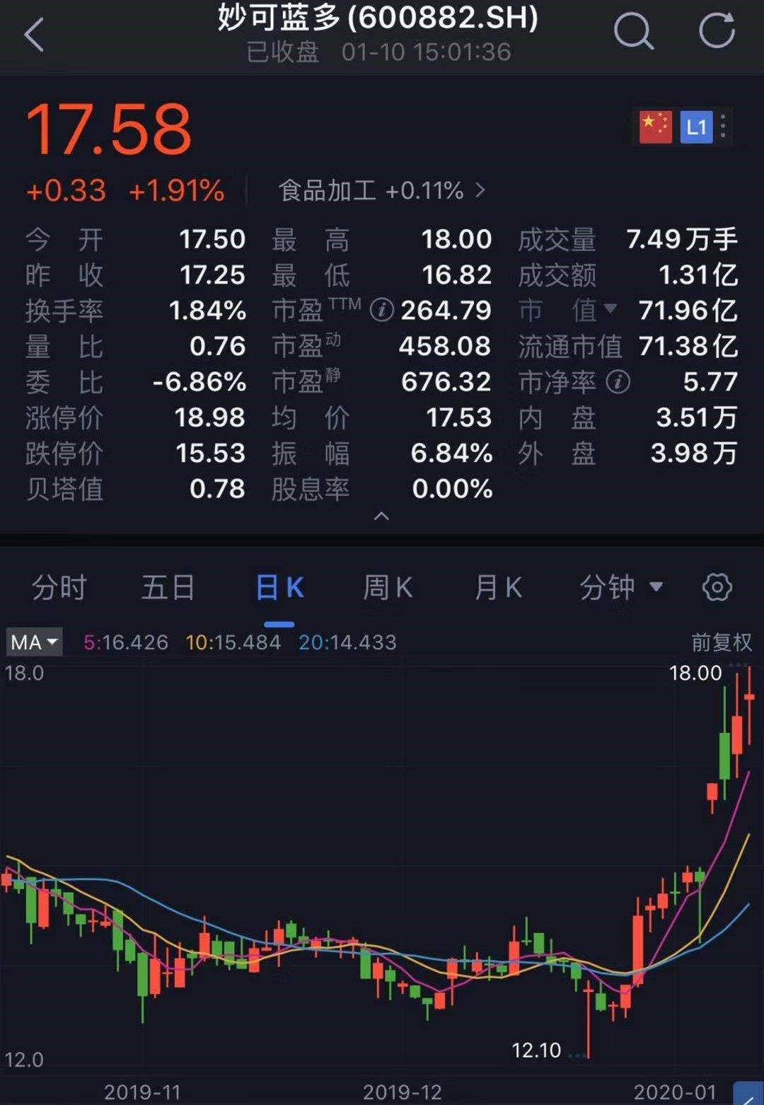 首次影响,妙可蓝多股价一路飞涨,在1月10日创下9年来新高。