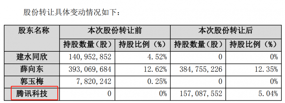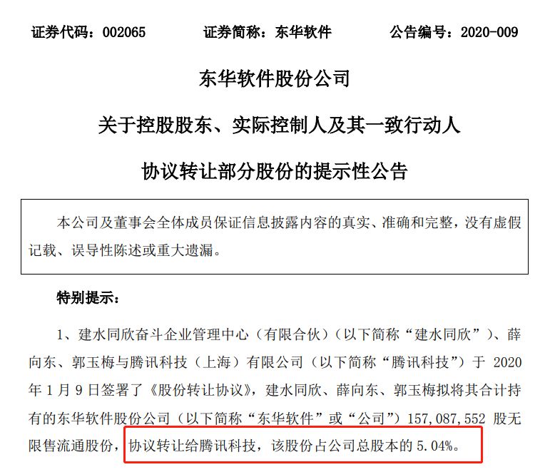 1月10日下午收盘后,东华软件公告,公司控股股东、实际控制人及其一致行动人建水同欣、薛向东、郭玉梅与腾讯科技签署了《股份转让协议》,拟将其合计持有的公司1.57亿股无限售流通股份,协议转让给腾讯科技,该股份占公司总股本的5.04%。