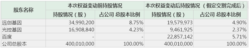 根据股份购买协议,远创基因、光控基因拟分别将持有的公司3.85%、1.86%股份转让给百度,交易价格为协议签署日的前一交易日公司收盘价的95%,即26.25元/股。交易完成后,百度将持有公司股份2286万股,占公司总股本的5.71%。据此测算,百度获得股份的总对价约为6亿元。