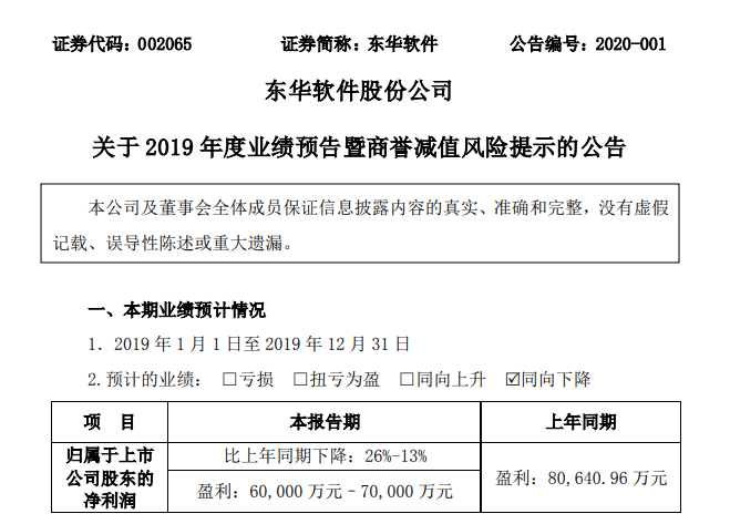 1月初,公司发公告称预计2019年净利润6亿元-7亿元,其中包含商誉减值的3亿元至4亿元,相比2018年净利润,2019年同比下降13%至26%之间。