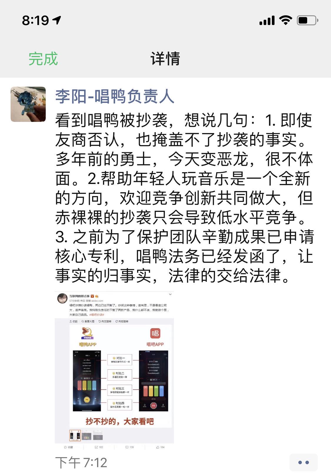 李阳10日傍晚在朋友圈发文:看到唱鸭被抄袭,想说几句:1、即使友商否认,也掩盖不了抄袭的事实。多年前的勇士,今天变恶龙,很不体面。2、帮助年轻人玩音乐是一个全新的方向,欢迎竞争创新共同做大,但赤裸裸的抄袭只会导致低水平竞争。3.、之前为了保护团队辛勤成果已申请核心专利,唱鸭法务已经发函了,让事实的归事实,法律的交给法律。