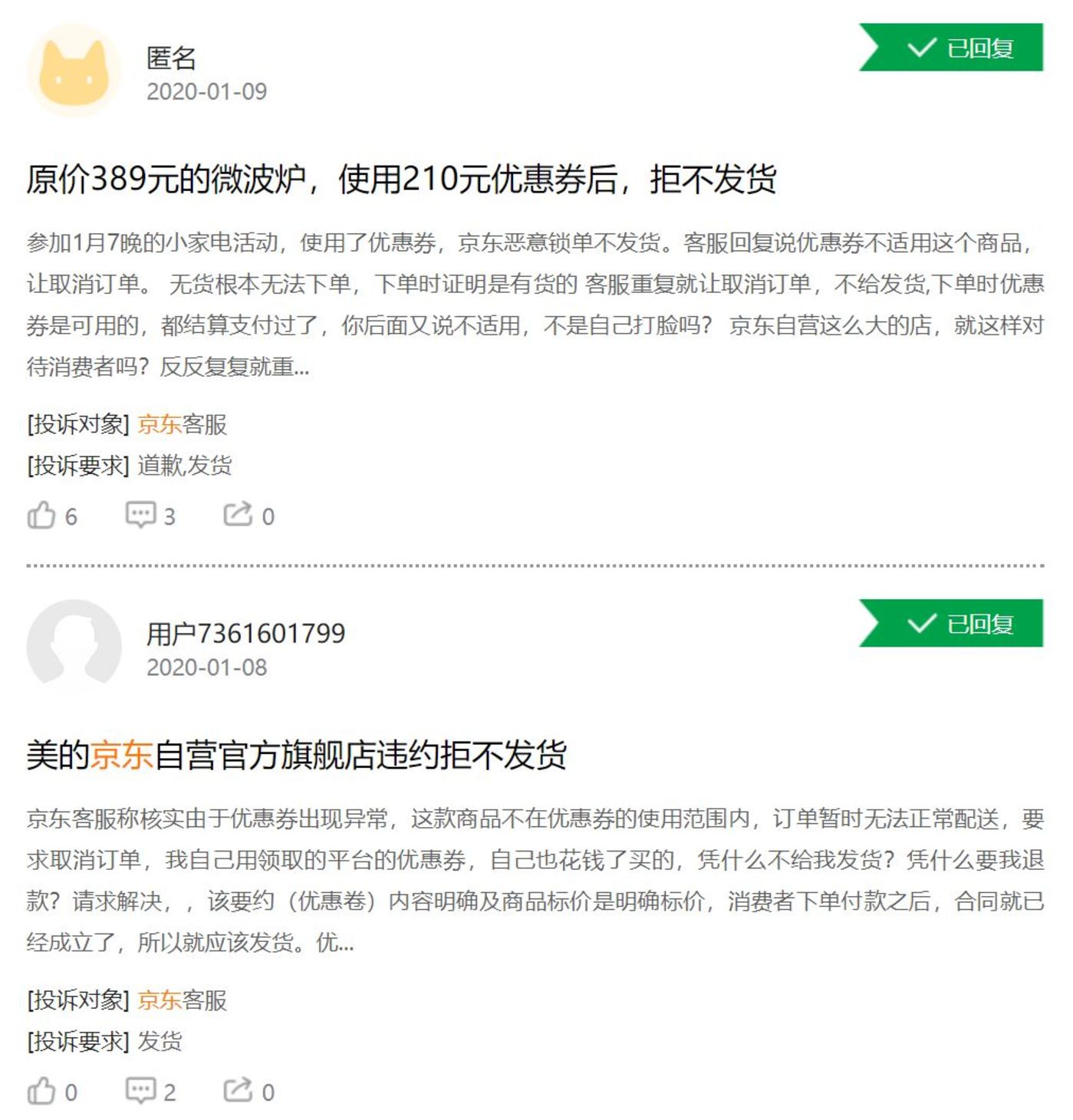 黑猫投诉上已经出现了大量关于京东不发货的投诉。