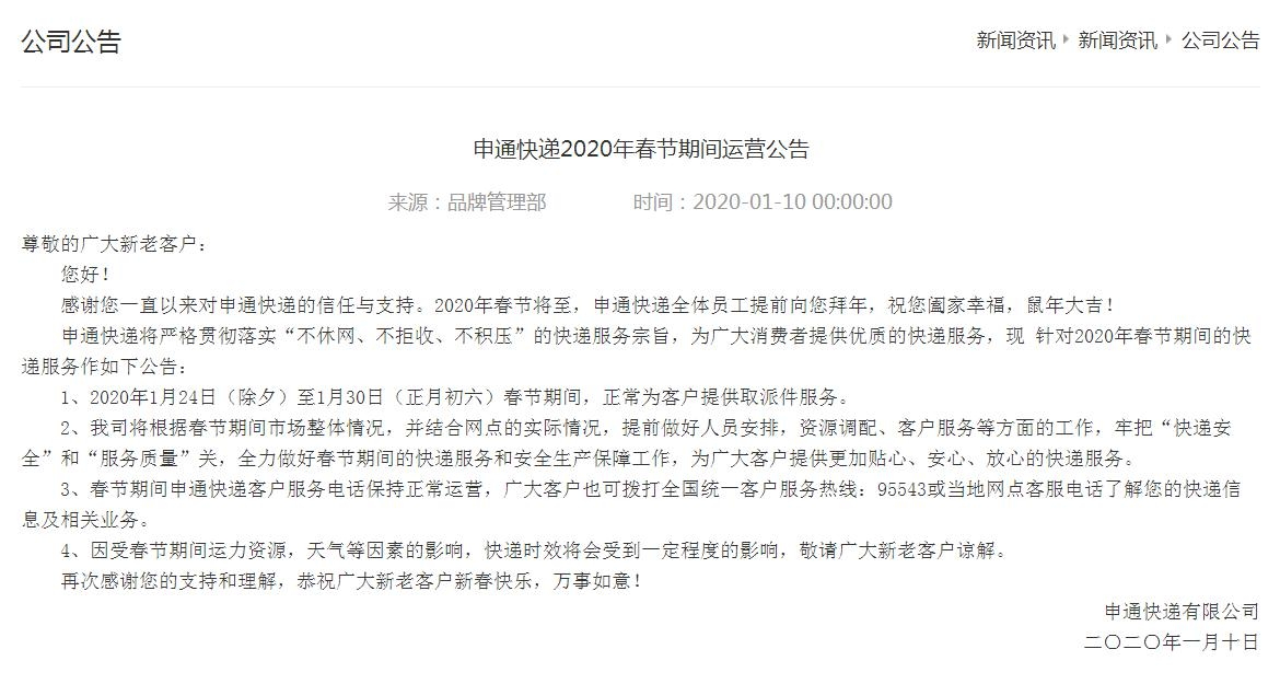 此前,2020年1月初,“三通一达”及顺丰速运纷纷发公告称提供“全年无休”的快递服务,其中圆通速递对“30城市做时效承诺”,中通快递推出“全国31个重点城市快递时效保障”,让每一件包裹按时送达。
