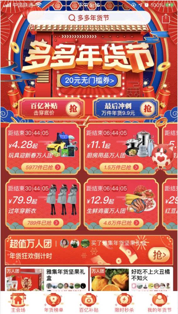 在从2019年12月20日到今年1月15日年货节期间,拼多多除了“年货系列万人团”、“百亿补贴”、“限时秒杀”的特惠商品和优惠券以外,没有太多复杂的玩法,直接通过优惠券等手段向用户发放了总额达40亿元的红包补贴。