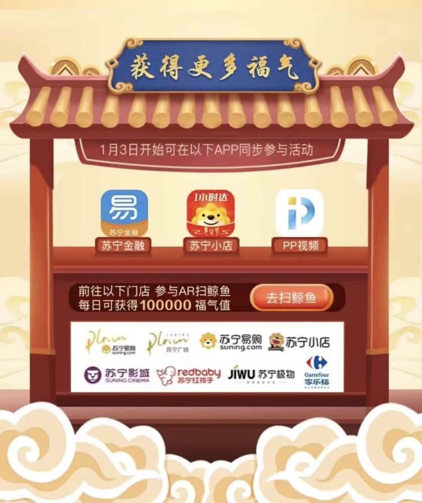 另外苏宁还有一点线上线下联动的优势:除了苏宁线上的产品矩阵同步开启了活动以外,用户还可以在苏宁的线下门店通过扫鲸鱼额外获得高额福气值,联动的门店包括苏宁易购、苏宁影城、家乐福等等,用户扫码可获得高达10万的福气值。