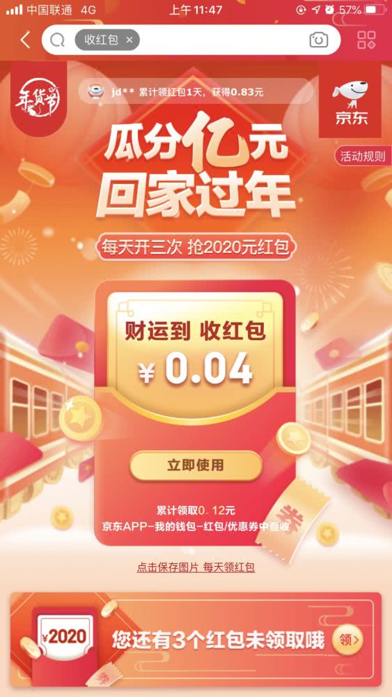 “亿元红包”只要在1月5日-2月14日,在京东app内搜索“收红包”进入活动页面就可以随机抽取红包或满减东券,最高2020元。