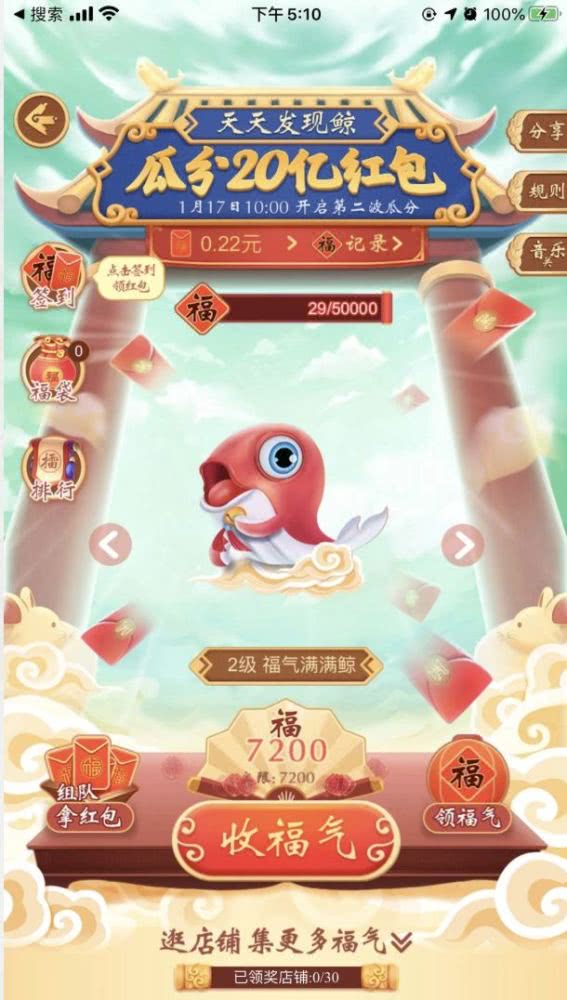 活动期间,用户通过逛店铺、逛年货、买年货、看会场视频、看年货直播、去小苏的农庄、玩狮狮连萌、分享活动、到其他业态领福气等9大招可以收集到福气值。收集到的福气值越多,福袋将变得越大,鲸鱼升级也越快,可领取的红包金额也越大。