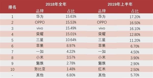 2019 年上半年度手机品牌关注度,华为、OPPO、vivo 已经坐稳用户关注度前三把交椅。相比较之下,苹果关注度排名第六,而在 2018 年时苹果关注度也是排名第六。