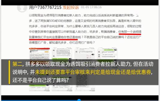 第二,拼多多以领取现金为诱饵吸引消费者拉新人助力,但在活动说明中,并未提到还要靠平台审核来判定是给现金还是给优惠券,不就是平台自己说了算吗?