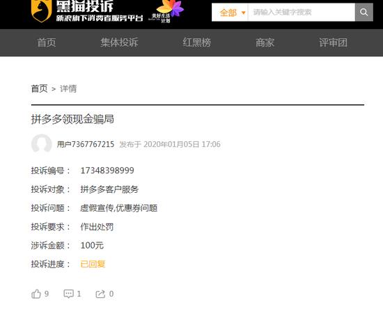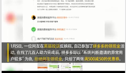 炣燃科技1月16日综合新浪网报道1月5日,一位网友在黑猫投诉反映称,自己参加了拼多多的领现金活动,在找了几百人助力完成后,拼多多却以“系统判断邀请的异常用户较多”为由,拒绝网友领现金,只送了两张满500减50的优惠券。