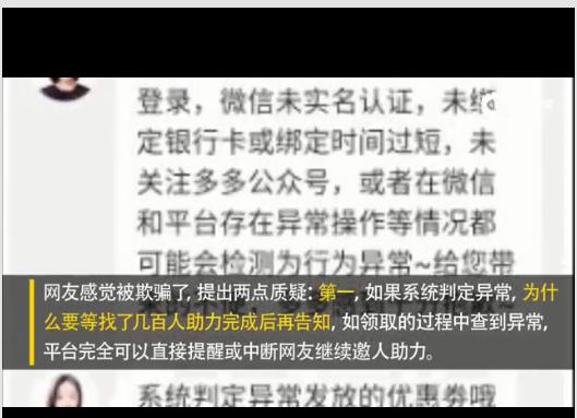 网友对此表示不满,感觉被欺骗了,并提出两点质疑:第一,如果系统判定异常,为什么要等网友找了几百人助力完成后再告知,如领取的过程中查到异常,平台完全可以直接提醒或中断网友继续邀人助力。