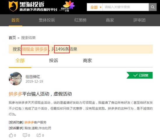 在黑猫平台上搜索相应关键词,可以看到该网友的遭遇并非个案,拼多多领现金活动被不少网友投诉过。