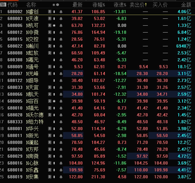 其中,安集科技涨287.85%,报152元;澜起科技268.15%,报91.30元;科创板第一股华兴源创涨128.35%,报55.40元。但随后不久,多只科创板个股大幅高开后快速回落,向下触发临停线。截至9:40,N睿创、N天准、N中微、N交控、N乐鑫、N翰川、N虹软、N嘉元均已向下触发首次临停。