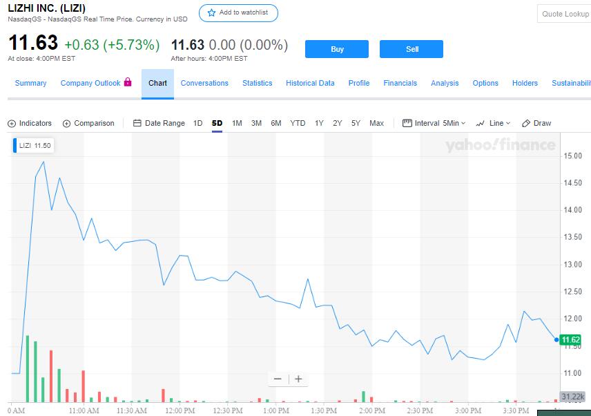美东时间1月17日周五,原名荔枝FM的荔枝以LIZI为代码登陆纳斯达克,开盘价11.03美元,开盘涨幅不到0.3%,但涨幅很快扩大,开盘不到一小时涨至15.25美元,涨幅达到38.6%,此后涨幅逐步收窄,到收盘前一小时,已经不足4%,最终收涨5.73%,收报11.63美元。