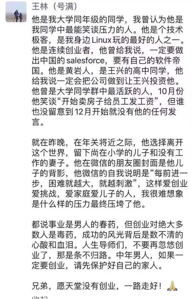 “都说事业是男人的春药,但创业对绝大多数人都是毒药,成功的风光背后是数不清的心酸和血泪。兄弟,愿天堂没有创业,一路走好。”