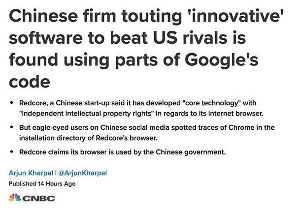 红芯浏览器开发商宣布采用了全新浏览器内核,由国人完全自主开发。 但是事与愿违,有人反解压红芯浏览器之后,发现了Chrome浏览器内核的痕迹。因此证明红芯浏览器所谓的国产自研内核是一场骗局。