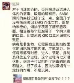 今天,一张声称“吸烟能预防病毒感染”的图在社交平台传播开了。图中显示,“全国几乎没有吸烟者因SARS而死亡"、“烟油子可以阻挡病毒的附着和进入,断了根本。”