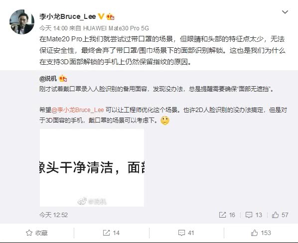 李小龙科普道:“在Mate20 Pro上我们就尝试过带口罩的场景,但眼睛和头部的特征点太少,无法保证安全性,最终舍弃了带口罩/围巾场景下的面部识别解锁。这也是我们为什么在支持3D面部解锁的手机上仍然保留指纹的原因。”