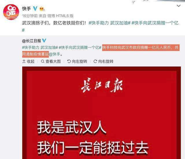 据武汉广播电视台官方微博消息,为抗击新型肺炎,快手向武汉市捐赠1亿元。