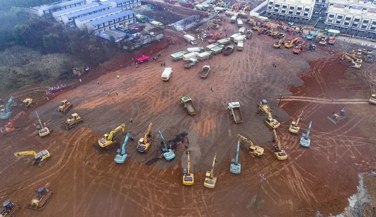 1月24日,武汉阴雨绵绵,但在蔡甸知音湖畔的工地上,各种建筑设备丝毫不受天气影响照常开工。这里正在新建的火神山医院,将专门集中收治新型冠状病毒肺炎患者。因参照抗击非典期间北京小汤山医院模式,该医院也被称为武汉版的“小汤山医院”。