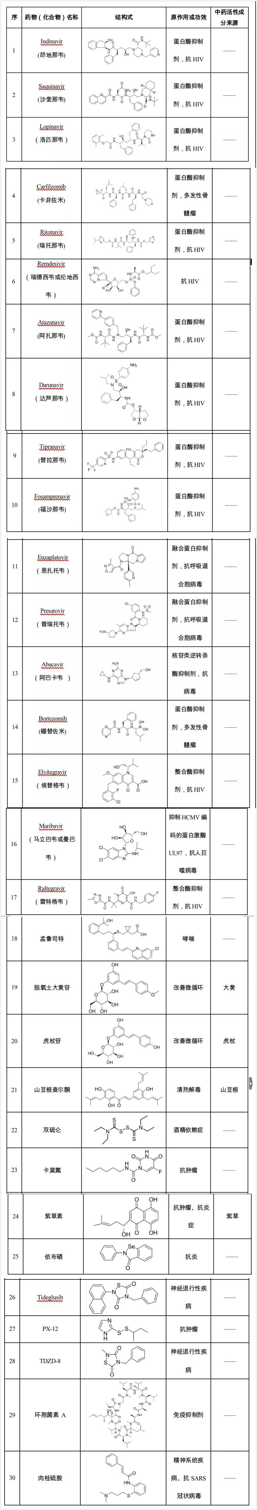 候选药物包括蛋白酶抑制剂茚地那韦(Indinavir)、沙奎那韦(Saquinavir)、洛匹那韦(Lopinavir)、卡非佐米(Carfilzomib)、利托那韦(ritonavir)等12种抗HIV药物,2种抗呼吸道合胞病毒药物,1种抗人巨噬病毒药物,1种抗精神分裂症药物,1种免疫抑制剂以及2种其他类药物;发现含有“二苯乙烯”结构的孟鲁司特以及植物药活性成分虎杖苷和脱氧土大黄苷与Mpro结合较好,可能对病毒有抑制作用;在前期抗SARS研究及计算机模拟基础上发现老药肉桂硫胺、环孢菌素A可能对2019-nCoV有效,其中肉桂硫胺是上世纪70年代用于抗精神分裂症的药物,对冠状病毒3CL水解酶具有抑制作用,免疫抑制剂环孢菌素A可以阻止病毒的核衣壳蛋白与人的环孢亲和素A相互结合,已有研究表明联用干扰素和环孢菌素A能显著抑制冠状病毒在人类支气管和肺部复制及造成的组织损伤。他们研究还发现,虎杖、山豆根等中药材中可能含有抗2019-nCoV有效成分。