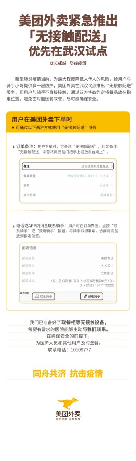 美团外卖相关负责人表示,“我们紧急抽调了产品技术人员,赶在大年三十完成了‘无接触配送’方案的研发及上线。希望通过此举,改变此前‘手传手’的送餐模式,避免面对面接触,降低风险。”