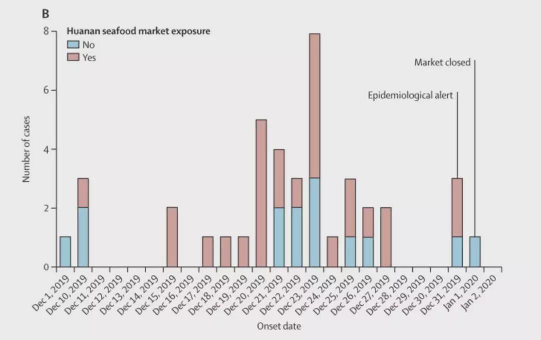 图 | 早期患者中多数有华南海鲜市场接触史(来源:《柳叶刀》)